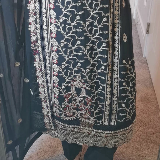 Dupatta is chiffon, black color, embroidered throughout with heavy embroidery at the 2 long sides.