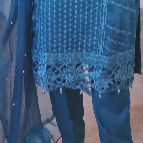 Neckline is heavily embroidered with silver thread, pearls and beads design.