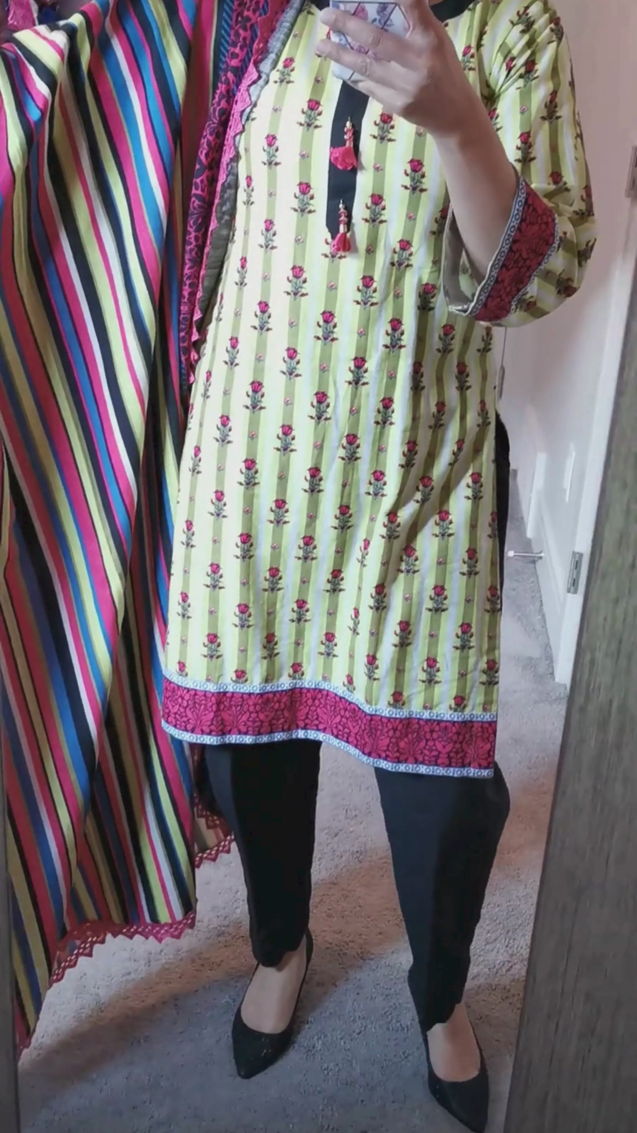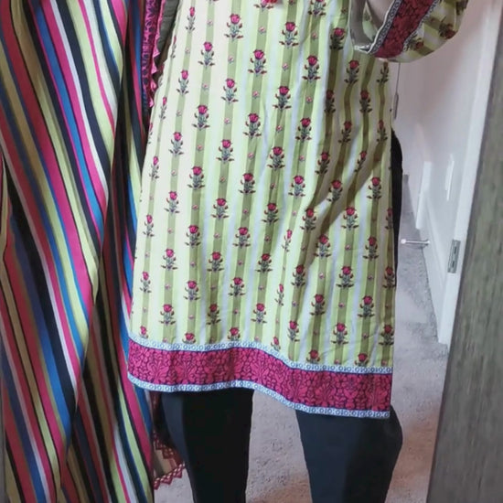 Kameez is soft heavy weight khaddar , multicolor, digital printed through. Neckline is round with a small v with black design and beads design down the front.