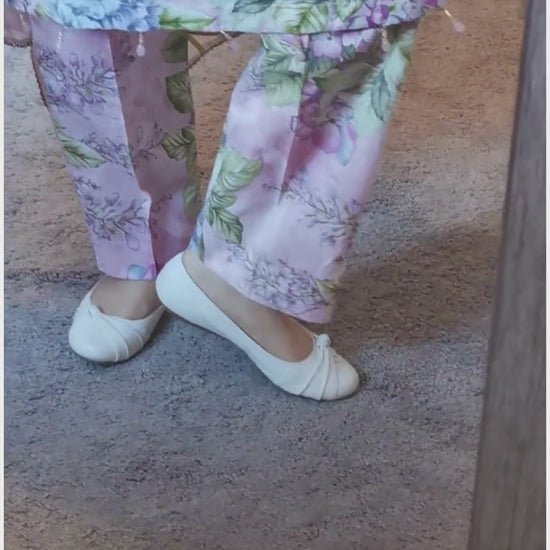 Trouser is lawn, pink color, wider straight leg, floral printed throughout, elastic waistband.