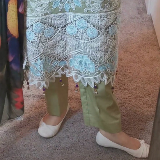 Kameez is lawn, sage green color, heavily embroidered throughout with cutwork.