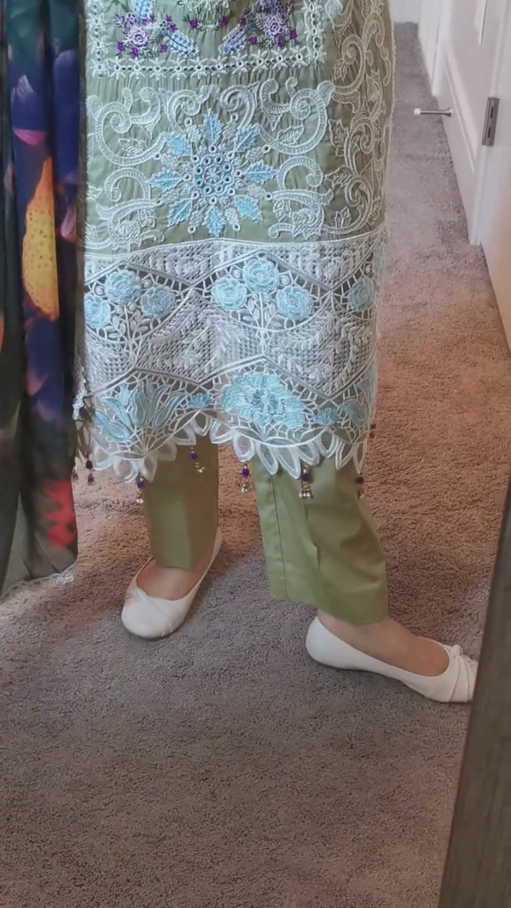 Back is heavily embroidered at the middle back and the bottom. Trouser is lawn, sage green color, straight leg, elastic waistband.