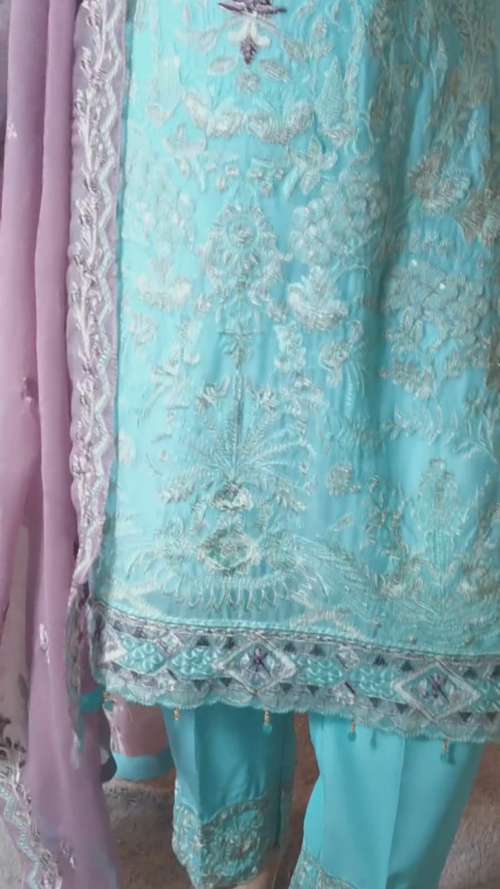 Dupatta is chiffon, light purple color, embroidered throughout with heavy embroidery on 2 long sides.